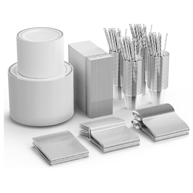 ROVSUN 800 Pcs Gold Disposable Dinnerware Set 100 Guests, Elegant Plastic Plates for Party Wedding,100 Dinner Plates, 100 Dessert Plates, 100 Cups, 10